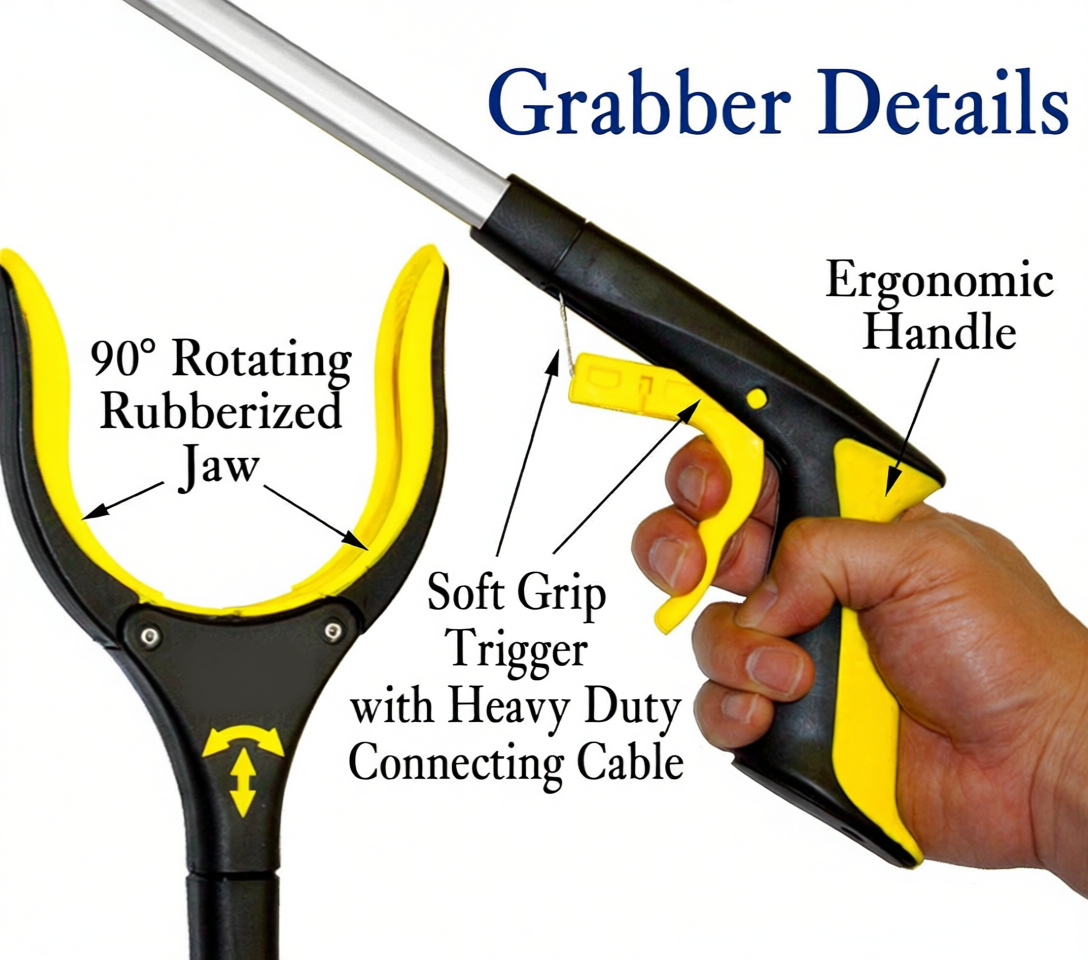 34" LONG GRABBER: Increases your reach by 34 inches so that you can pick up items from floor, top shelf, outdoor lawn, trash can, behind furniture, or other hard to reach places.