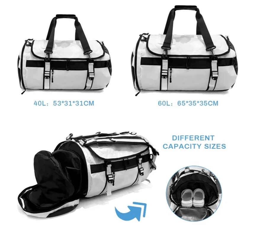 ● Large Capacity & Durable Build: Crafted from tough, waterproof fabric, it provides ample space (40L/60L) for long trips or gym essentials. The sturdy design withstands daily wear and tear, making it a reliable unisex choice for sports and travel.