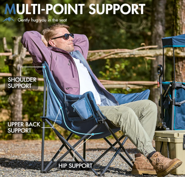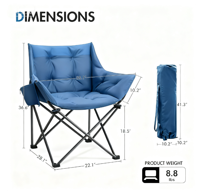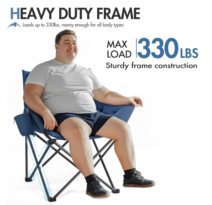 ●Convenience at Hand: Built-in cup holder keeps drinks within reach, while the side pocket of this camping chair stores your phone, book, or snacksSturdy & Reliable: Built as an oversized chair, it has a heavy-duty steel frame supporting up to 330 lbs while maintaining a lightweight design (8.8 lbs) for easy transport.