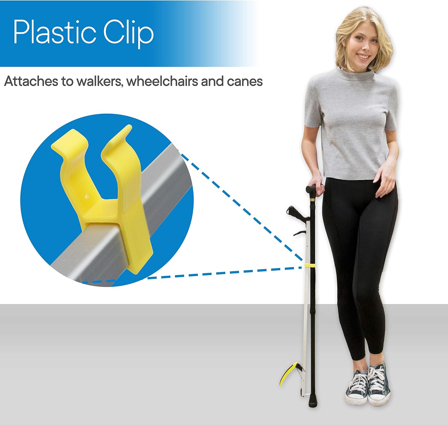 Yellow clip fastens reachers to canes, walkers, wheelchairs and hospital bed rails to keep them nearby