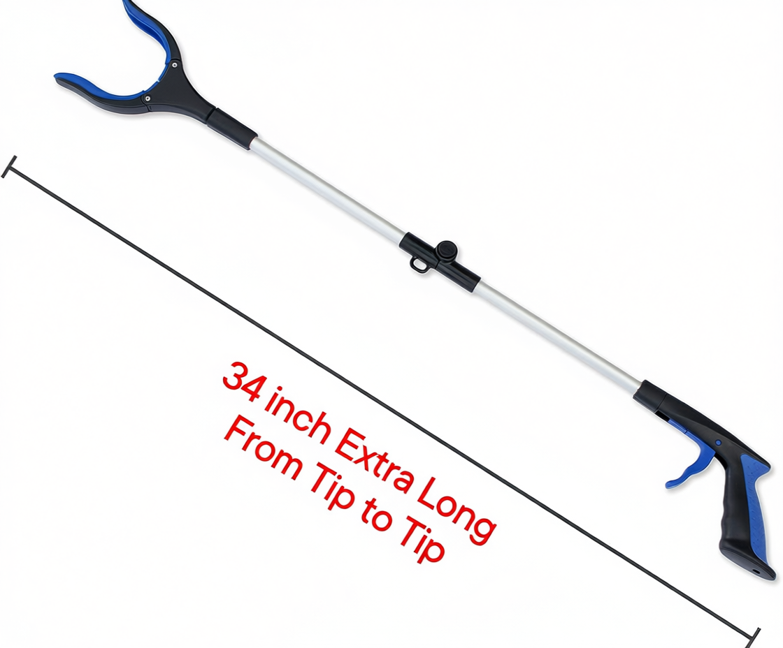 34" LONG: The grabber reacher measures 34 inches long from end to end. You can pick up items from the floor, top shelf, outdoor lawn, trash can, behind furniture, or other hard to reach places.